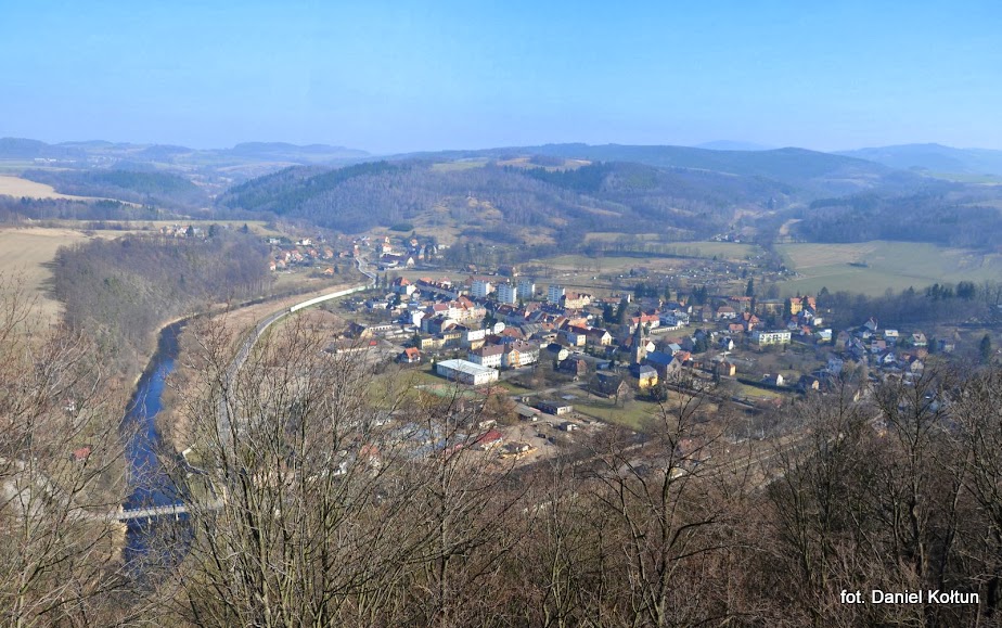 Przepiękna panorama Doliny Bobru, Pogórza Kaczawskiego i miejscowości Wleń